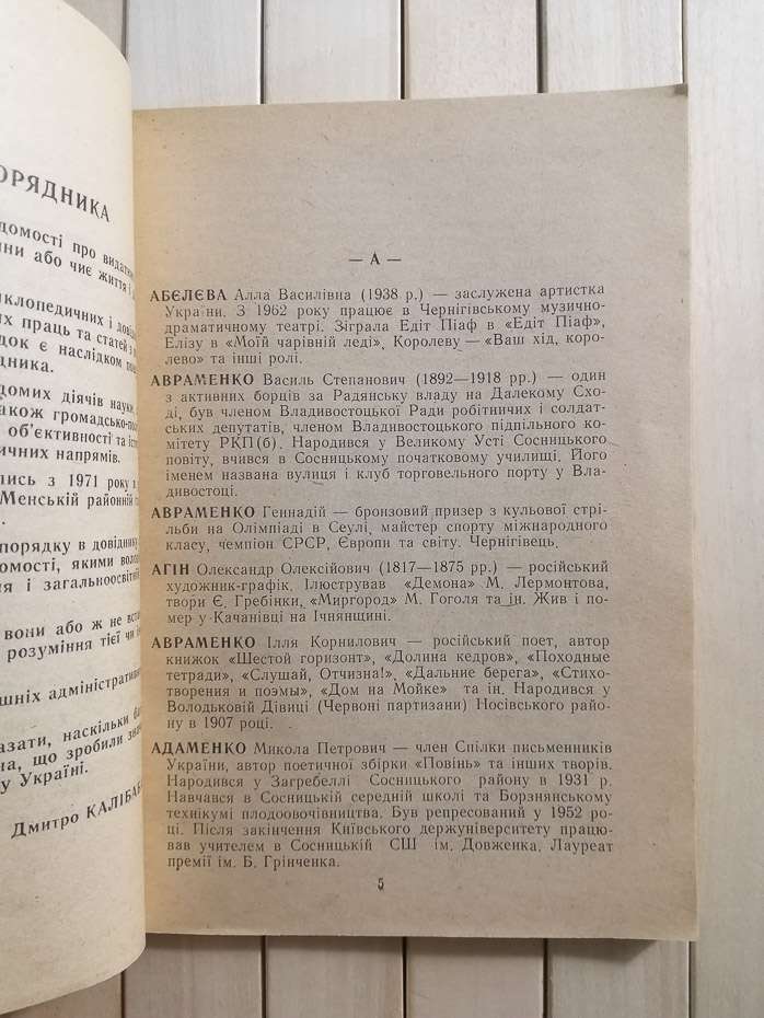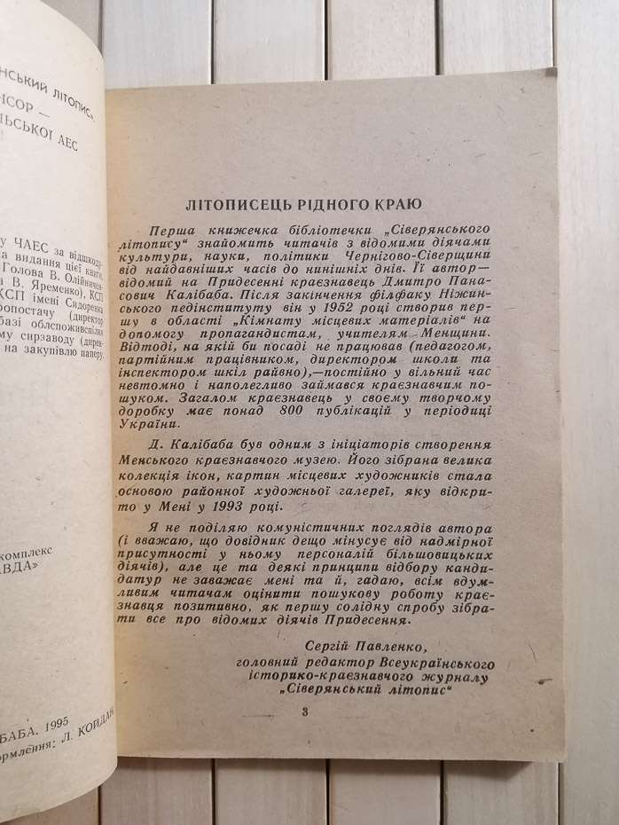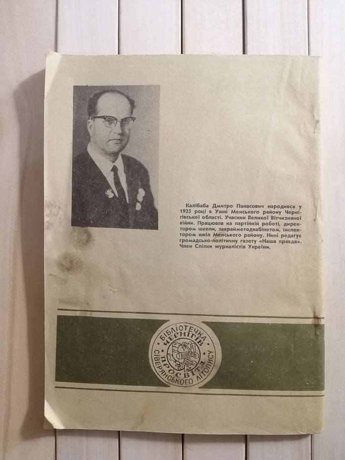 Перша книжечка бібліотечки „Сіверянського літопису" знайомить читачів з відомими діячами культури, науки, політики Чернігово-Сіверщини від найдавніших часів до нинішніх днів. Її автор-відомий на Придесенні краєзнавець Дмитро Панасович Калібаба. Після закінчення філфаку Ніжинського педінституту він у 1952 році створив першу в області „Кімнату місцевих матеріалів" на допомогу пропагандистам, учителям Менщини. Відтоді, на якій би посаді не працював (педагогом, партійним працівником, директором школи та інспектором шкіл райвно), — постійно у вільний час невтомно і наполегливо займався краєзнавчим пошуком. Загалом краєзнавець у своєму творчому доробку має понад 800 публікацій у періодиці України.
